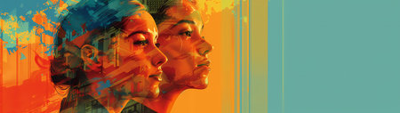 A vibrant portrayal of Latin American women in profile, showing colorful geometric shapes that emphasize individuality and the essence of gender equality in contemporary art.