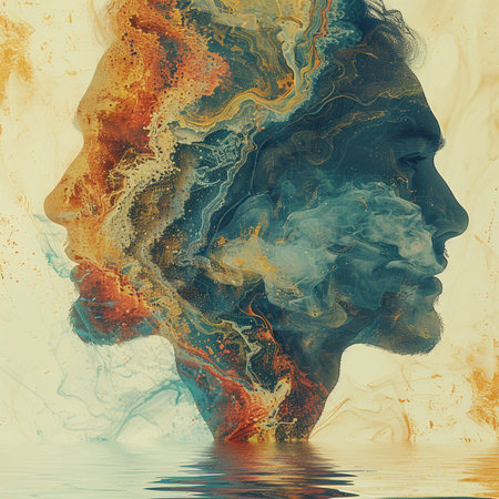 Artistic silhouettes of two human profiles in vibrant colors, showcasing an abstract background filled with yellow, red, and blue hues, creating a striking visual contrast