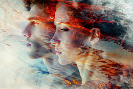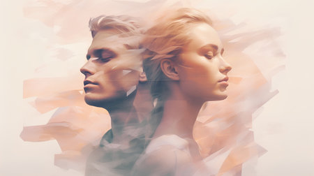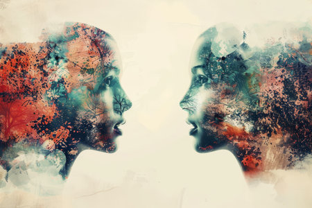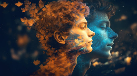A man and woman face each other, blended with nature elements, showing a unique artistic concept of connection.