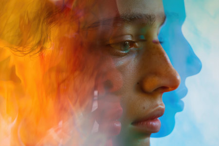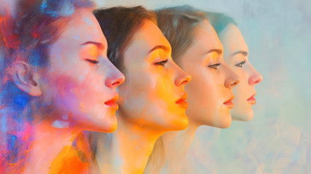 A womans face is portrayed against a vibrant, multicolored background. The colors blend harmoniously, creating a mesmerizing and artistic visual.