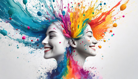 A vibrant, abstract depiction of a happy woman's head representing mental health and creativity. This colorful illustration reflects emotional well-being, positive thinking, and the power of