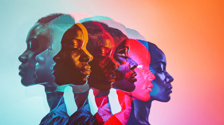 Six individuals of varied backgrounds are silhouetted from the side, highlighting their unique features against a vibrant, colorful background that symbolizes diversity and connection.