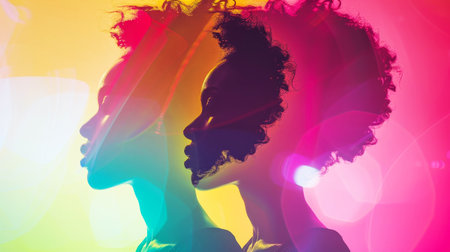 Two women with colorful hair in silhouette, standing back to back against a vibrant backdrop, exuding creativity and individuality.