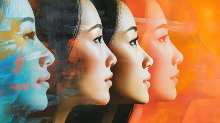 A captivating abstract portrayal of diverse Asian women in profile, celebrating individuality with striking colors and rich contrasts that highlight their expressions and emotions.