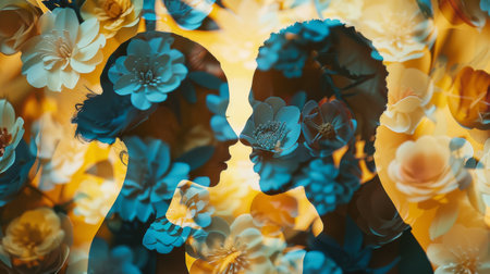 A double exposure portrait featuring a silhouette of a face filled with vibrant flowers, blending nature and human form