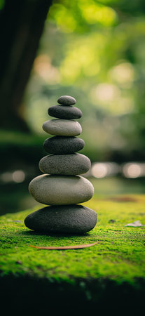 Smooth river stones balancing on vibrant moss near water, symbolizing peace and stability. Stacked river stones balancing on moss creating zen harmony wallpaper