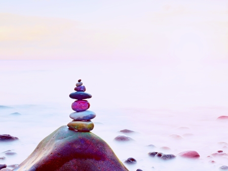 Balanced stone pyramide on shore of the ocean at dawn. Sea pebbles tower closeup symbolizing stability, zen, harmony, balance.