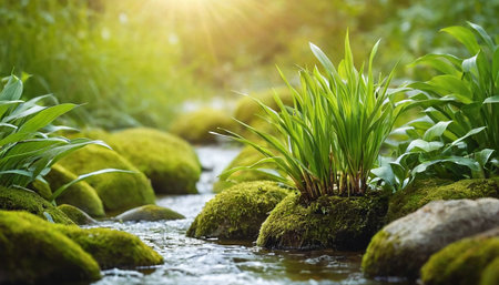 A serene stream flows through a vibrant forest, with clear water glistening and lush moss covering the rocks. Sunlight filters through the trees, creating a peaceful atmosphere.