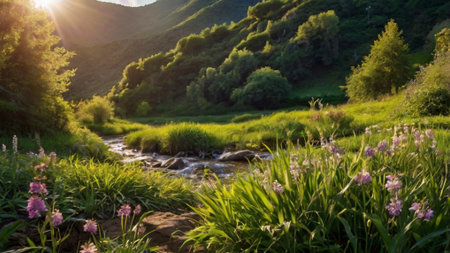 A stream gracefully cuts through a breathtaking hillside covered in lush green vegetation, A lush valley filled with wildflowers and a bubbling brook, AI Generated