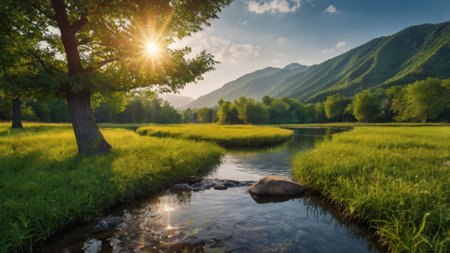 a serene and peaceful ambiance is captured in this uhd image of a small river adorned with plants, basking in the warm sunlight. reminiscent of poetic pastoral scenes from the danish golden age, this snapshot aesthetic, created in the style of unreal engine, showcases the beauty of nature in a mesmerizing 32k uhd resolution. ai generated