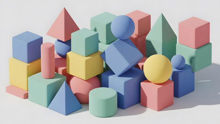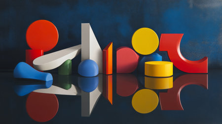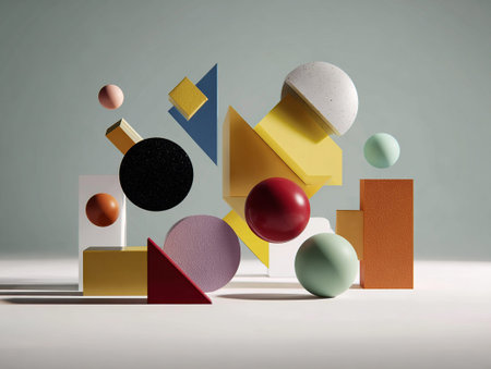 Colorful geometric shapes in a balanced arrangement on a minimalistic background, illustrating harmony and creativity through playful design elements and vibrant colors