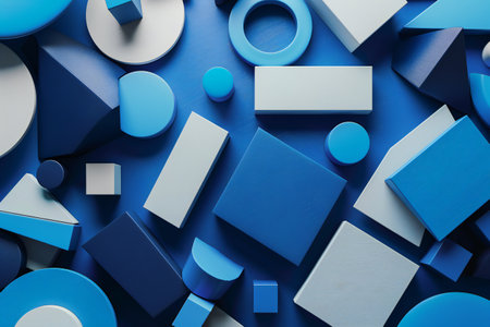 Geometric shapes in navy blue, royal blue, and sky blue colors, with a white background, 3D render, created by ai