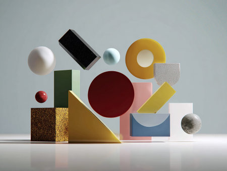 Explore a vibrant arrangement of geometric shapes in various colors on a minimalistic background. Ideal for creative design projects or art inspirations.