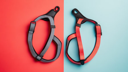 Explore the modern design of dual color pet harnesses set against vibrant backgrounds, perfect for ensuring comfort and safety during walks and adventures.