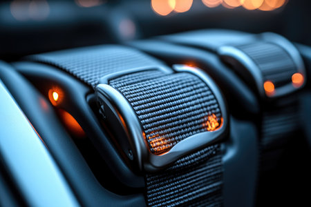 High-angle, close-up view of dark gray automotive seat belt buckles, with metallic accents and orange lighting.