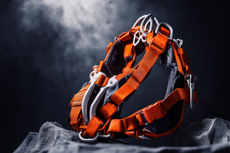 Sturdy climbing harness displayed on rocky surface, showing bright orange straps and sturdy construction.