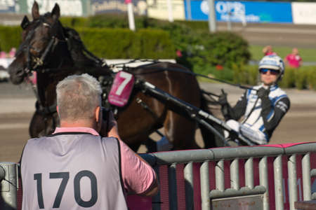 Stockholm, Sweden - August 5, 2015: Harness race driver Björn Goop preparing a horse at Solvalla race track. Björn Goop won Prix d’Amerique 2018 considered to be the biggest race in the world.