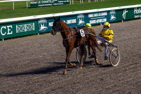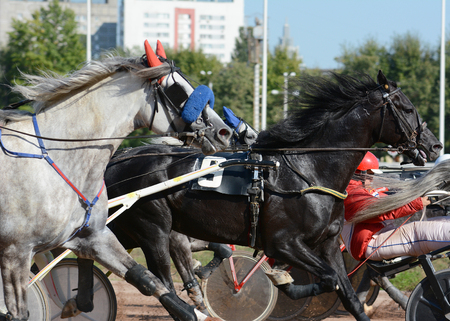 Equestrian sport. Harness racing. Horse race at hippodrome. Horses compete in harness racing
