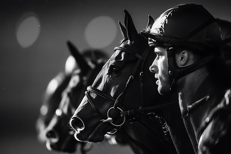 A close-up of a jockey in race gear, riding his horse with determination, showing focus and strength, ideal for horse racing advertisements