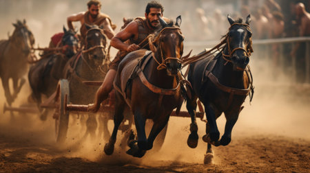 Chariot race in coliseum with dust excitement