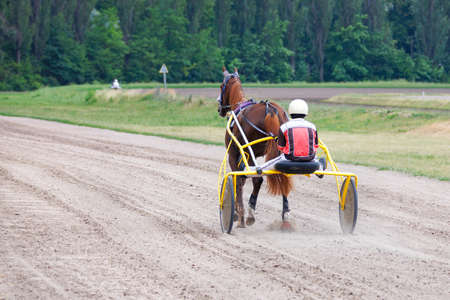 Harness racing. Racing horse harnessed to lightweight strollers.