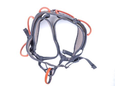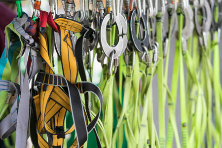 climbing equipment. climbing straps with safety ropes, aluminum carabiners, loops and braces on the bench. lifestyle. life saving equipments.