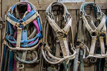 Ropes, chains, horse stable tools hanging on a fence at a horse farm.