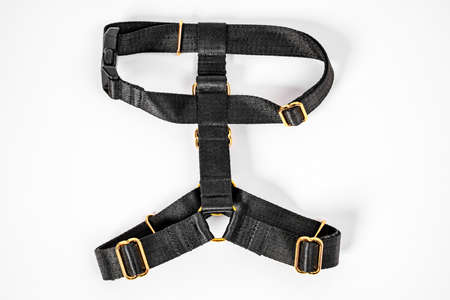 Black tissue dog harness with gold metal fittings isolated on white background. For a safe trip and walk with your pet. Pet Supplies and Walking Gear Collection