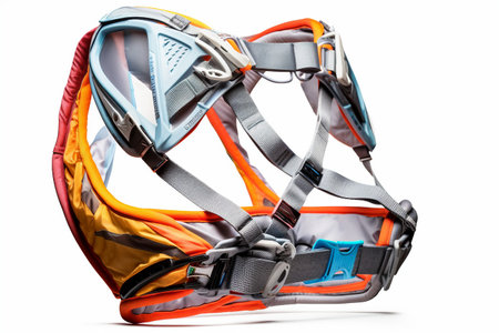 Safety belt for work at height with carabiner. Professional safety equipment for mountaineering and construction. safety precautions. close-up