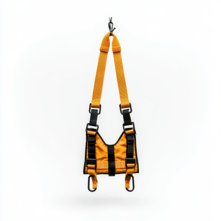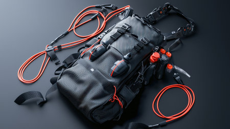 The design features vibrant red accents on a durable harness against a dark background, showcasing its structure.