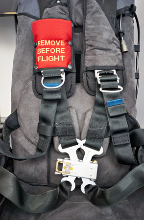 Aeroplane seatbelt buckle in low key dark moody photo. Artistic or different photo of a seatbelt buckle sitting on a chair made of leather.