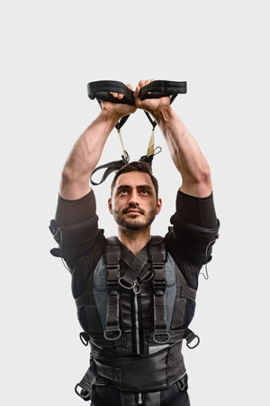 Portrait of strong young man doing EMS training for hands with resistance band, Muscle activation: Man training with electro stimulation, suitable for highlighting muscle engagemen