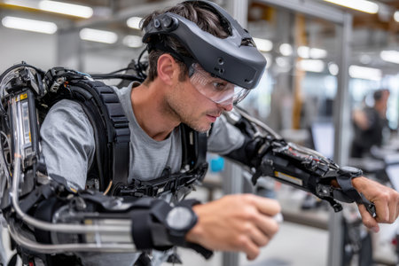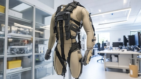 A man uses an exoskeleton suit while engaged in rehabilitation exercises at a modern facility.
