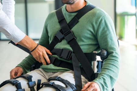 Mechanical exoskeleton, physiotherapist placing the tapes on the chest of the unrecognizable disabled person to place his robotic skeleton on him, physiotherapy in a modern hospital: