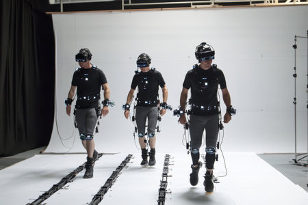 Three performers wear motion capture suits while walking on a track in a studio designed for animation creation.