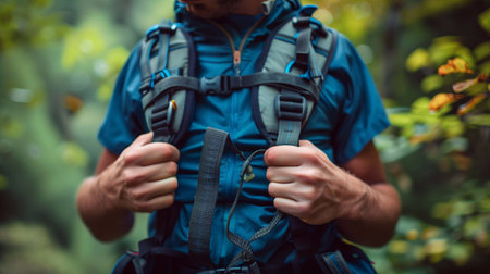 Close-up hands of unrecognizable explorer adjusting strap on modern stylish urban backpack, getting ready for commute or travel adventure, embodying convenience and functionality for active lifestyle.