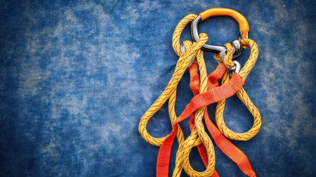 This image features colorful climbing gear including a carabiner and multi-colored ropes against a textured blue backdrop, symbolizing adventure sports and outdoor activities.