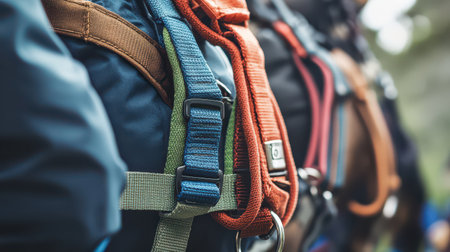 Various harnesses and straps on colorful backpacks await outdoor explorers in a forest setting showcasing preparation for a hiking trip.