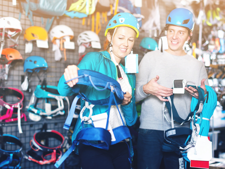 Girl and the guy choosing in the shop of sports equipment a mountaineering equipment. Focus on woman