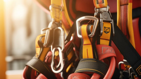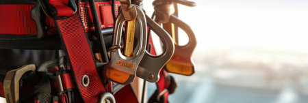 Safety belt for working at height with locks. Professional safety equipment for mountaineering and construction. Safety precautions. Blurred focus. Close-up