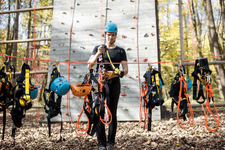 Handsome man wearing safety equipment for climbing at amusement park, preparing for climbing on the wall