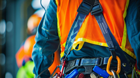 Close-up of construction worker tying safety harness, focus on safety and detailed gear,