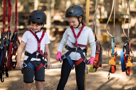 Equipment for climbing sport outdoor, rock climbing alpinism mountaineering gear with helmet, belt, carabiner, rope, harness with belay and protection for the high ropes course
