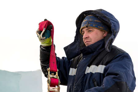 Portrait of a worker in a blue jacket with a hood at the hook of a truck crane
