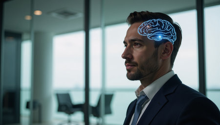 A businessman sporting a digital brain interface symbolizes the fusion of tech-intelligence and decisive thinking within a high-tech corporate setting