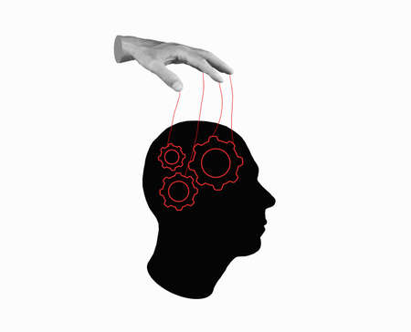 Power over human mind. Hand with strings and head on grey background. Manipulation of person consciousness, thoughts, opinion. Controlled people. High quality photo