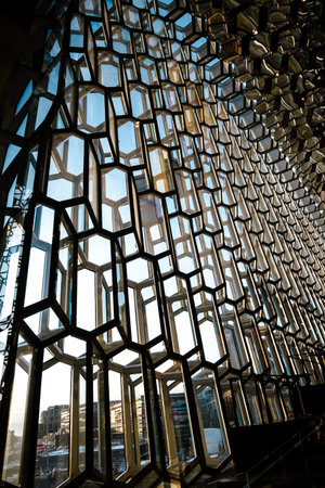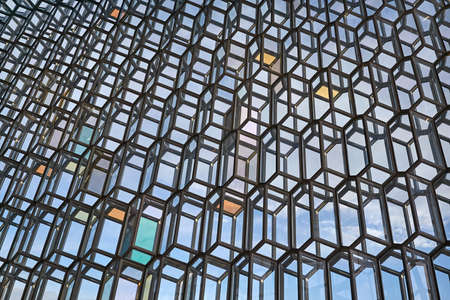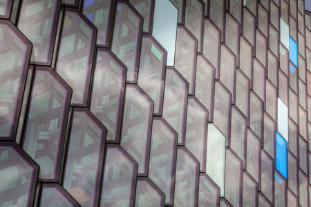 Reykjavik, Iceland, July 2019: Architecture close-up and detail of the Glass window design of the Harpa concert hall and conference centre