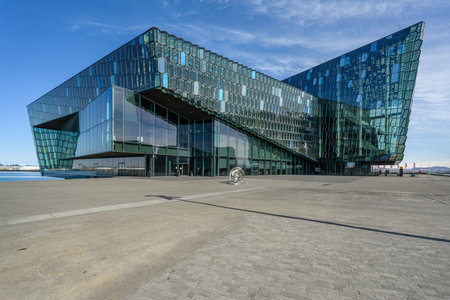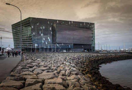 Reykjavik, Iceland - 24 September, 2016: Hapra Concert, a landmark of the city with glass windows, on the waterfront of central Reykjavik