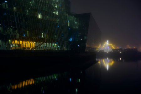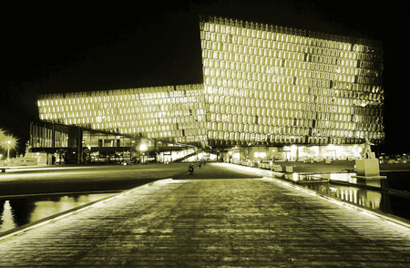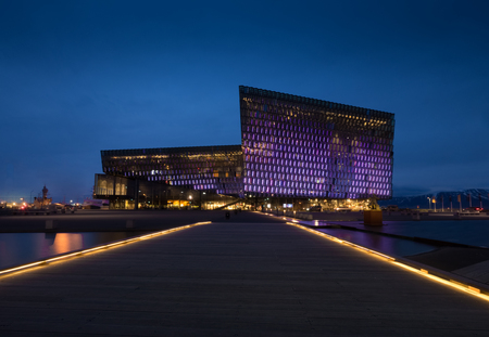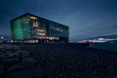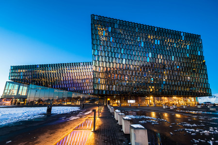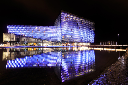 REYKJAVIK, ICELAND - MARCH 26, 2015: Night scene of Harpa Concert Hall in Reykjavik, Iceland. It was opened on May 4, 2013.