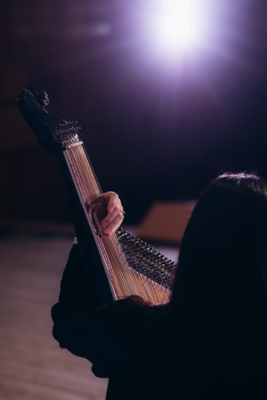Harp player playing Irish harp strings closeup Music instruments close up harpist hands